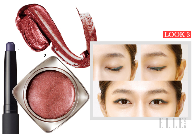 유니크한 색감을 골라 컬러 라이너로 연출해 보자. 손에 묻어나는 양을 최소화하고, 선명한 색상과 날렵한 라인 느낌을 잘 살리기 위해 납작한 라이너 브러시나 아이 틴트에 달린 애플리케이터 사용을 권장한다. 초보라면 단숨에 그리려 하지 말고, 손등을 팔레트 삼아 양을 조절하며 조금씩 메우듯 그려나갈 것. 상단 왼쪽 사진처럼 눈꼬리에만 에지 있게 포인트를 주거나, 상단 오른쪽처럼 본인의 눈매를 따라 그릴 수도 있다. 완성된 눈 사진은 자연스러운 컬러 라인으로 연출한 경우.