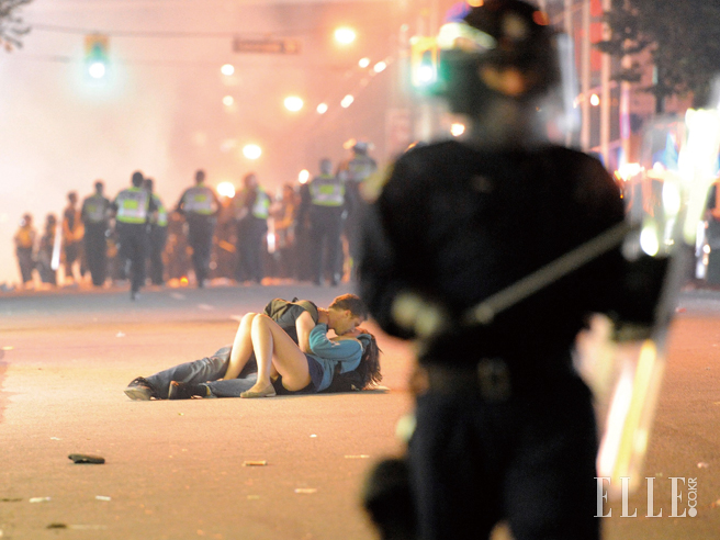 긴급해 보이는 상황 속에서 길바닥에 누워 입맞춤을 나누고 있는 연인. 일명 ‘밴쿠버 폭동 키스’라 불리며 유명세를 탄 사진이다. 2011년 6월 15일, 북미 아이스하키 리그 ‘스탠리 컵’ 결승에서 밴쿠버 팀이 미국 보스턴 팀에 완패하자 성난 관중이 폭동을 일으켰고, 진압을 위해 출동한 경찰들에 밀려쓰러진 사진 속 남자가 놀란 애인을 안심시키고자 키스한 것으로 알려졌다. <라이프>지에 실렸던 ‘해병의 키스’(1945), 로베르 두아노의 ‘드빌 호텔 옆에서의 키스’(1950) 등 널리 알려진 길거리 키스 사진의 계보를 잇는다.