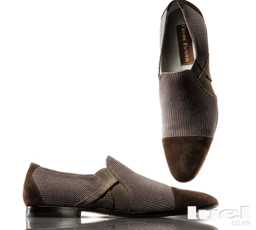 4 Bold but Acceptable 새롭고 과감하다고 무조건 과하고 피해야 할 것은 아니다. 특히 슈즈에서는. 우리나라 남자들에게 신발로 멋을 내기란 참 힘든 일이다. 화이트 슈즈를 ‘빽구두’로 부르는 것에서 알 수 있듯 남자의 새로운 슈즈에 대해 비아냥 거리는 분위기가 가장 큰 원인이다. 비난의 화살이 집중되는 슈즈들은 ‘빽구두’ 외에도 앞코가 뾰족한 것, 독특한 소재를 사용한 것, 디자인이 너무 화려한 것 등 꽤 여러가지다. 하지만 앞코가 날렵하게 빠진 슈즈는 정통 클래식을 표현해주고, 벨벳 같은 독특한 소재는 고급스러움을 극대화하며, 슈즈 디자인의 변화는 심플한 남성 패션에 액센트 역할을 하기 때문에 무조건 포기하기엔 너무 아쉬운 게 사실이다. 체사레 파조티의 이 슈즈는 그런 아쉬움도 달래주고, 기존의 비아냥거림도 너끈히 피해갈 만하다. 일단 앞코가 상당히 날렵하지만 앞쪽에 다크 브라운 스웨이드 소재를 사용해 날카로움을 부드럽게 감쌌다. 독특한 매시 소재는 고급스러운 컬러 덕에 너무 튀지 않고, 슈즈 좌우에 이중으로 처리한 밴드 디자인은 화려하다기 보다 착용감을 높인다는 평가를 받기에 충분하다. 밑창에 칠해진 진한 빨강생은 세련되지만 때로는 과감한 미스터 루엘의 취향을 은근히 드러내는 듯해 더욱 시선이 간다. 스웨이드와 매시소재, 밴드 디자인으로 변화를 준 슈즈 1백만원대 체사레 파조티 |