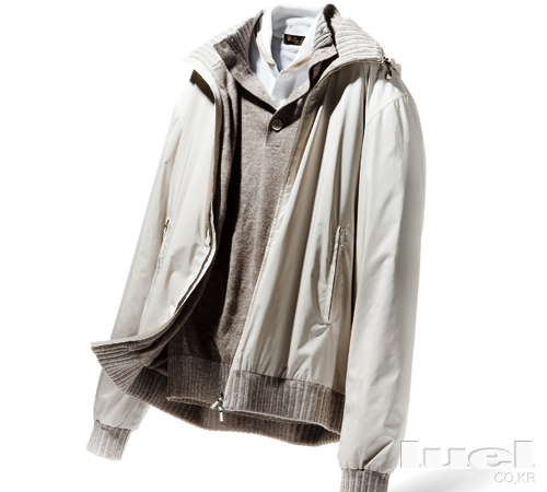 7 Light Breeze 날아갈 듯 가벼운 천연 섬유가 바람을 막고 비까지 막는다? 로로피아나의 오크만 봄버에 숨겨진 비밀이다. 아이보리 컬러의 스포티한 스프링 점퍼, 무난해도 너무 무난하다. 하지만 이 오크만 봄버의 비밀을 알게 되는 순간 이것이 결코 평범하지 않은 점퍼임을 깨닫게 된다. 비밀의 열쇠는 미끄러질 듯 보들보들한 원단이다. 로로피아나가 각고의 노력끝에 개발한 스톰시스템R을 적용한 원단 말이다. 이 기술을 쉽게 설명하자면 천연 원단에 이 시스템을 입혀 방풍과 방수 기능이 있는 새로운 원단을 만든다는 얘기다. 오크만 봄버의 겉감으로 사용된 마이크로 파이버 소재가 바로 이 윈드스톰시스템R을 사용한 것이다. 아주 얇은 막이지만 외부로부터 바람을 막고, 비도 막는다. 그럼에도 입었을 때 답답하지 않다. 천연 섬유의 통기성이 그대로 살아 있기 때문이다. 안감은 캐시미어와 실크 혼방 소재로 만들어 부드러움을 배가시켰다. 평범한 외모에 비범한 재주를 감추고 있는 ‘실력자’같은 아이템인 셈. 공기가 찬 간절기에 알차게 활용할 수 있을 뿐더러 사시사철 이어지는 레저 라이프에도 유용하다. 가격은 3백43만원.