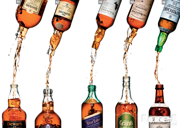 5 라프로익 → 발렌타인 30년 6공 시절, 어느 ‘보통 사람’ 덕분에 국내에 널리 알려진 술이 발렌타인 30년이다. 1920년대부터 출시되어 특히 한국과 일본에서 대표적인 프리미엄 위스키로 자리잡은 이 위스키에는 글렌버기(Glenburgie)와 밀톤더프(Miltonduff), 그리고 스코틀랜드 아이라섬의 신비를 간직한 라프로익 증류소의 30년 이상 숙성 위스키 원액이 함유되어 있다. 가장 부드러운 위스키에 가장 파워풀한 위스키가 함께 하고 있다는 점이 아이러니컬하지만 오래된 아이라 위스키가 품고 있는 강건함이야말로 고숙성 위스키의 품위를 지켜준다고 말하고 싶다. 라프로익은 1815년 알렉스 존스톤에 의해 설립된 증류소로 아직 수공업 방식으로 위스키를 생산하고 있다. ‘There is a thin line between love and hate’라는 슬로건으로 판매할만큼 개성이 강하다. 강한 크레졸향 덕분에 미국 금주령 시대에는 의료용 소독약으로 위장해 수출되기도 했다. 국내에는 라프로익 25년이 수입되고 있으니 발렌타인 30년의 젠틀함과 라프로익의 강인함을 함께 비교해봐도 좋을 듯 하다.