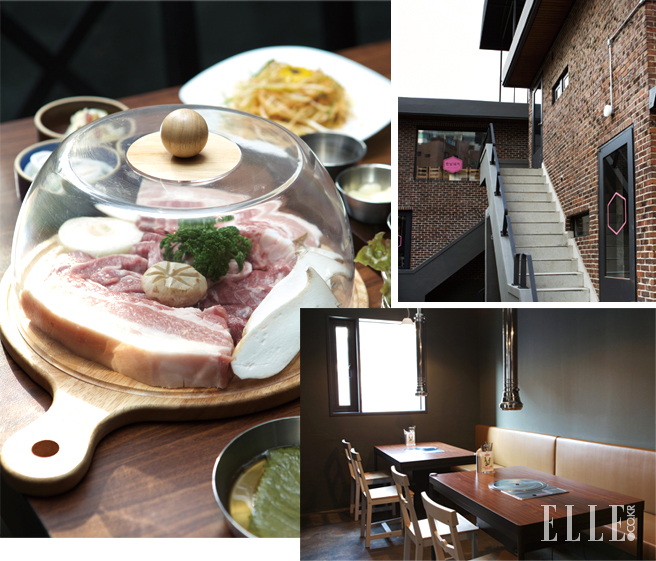 그간 유엔 빌리지 인근의 한남동엔 제대로 된 돼지 고깃집이 없었다. 이를 간파한 ‘카인드(Kind)’의 대표이자 파리에서 실내 건축을 공부한 류상엽 대표가 차린 한남 돼지는 판에 박힌 고깃집과는 다르다. 선명한 핑크 컬러의 엠블럼이 박힌 문을 열고 들어가면 ‘파인 레스토랑’이 떠오르는 단정한 실내 풍경이 펼쳐진다. 고깃집에 필요한 최소한의 ‘인프라’만 남긴 채, 불필요한 장식들은 제거한 모양새. 유리 돔을 덮은 커팅 보드에 담아주는 생고기, 옷에 고기 냄새가 배는 것을 방지하기 위해 마련한 철제 캐비닛은 신의 한 수처럼 여겨진다.