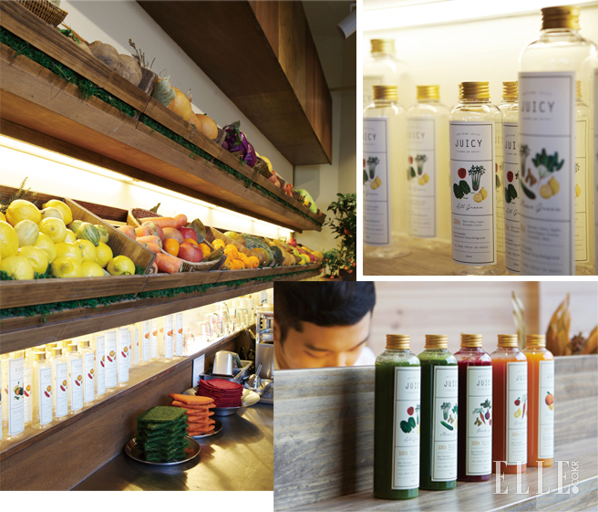 경리단 길의 새로운 랜드마크 ‘스트릿 츄러스’ 골목에 갖은 색을 지닌 공간을 속속 오픈하고 있는 엘리펀트 디자인에서 이번엔 주스 집을 차렸다. <엘르>가 사랑하는 푸드 디자이너 박세훈과 더불어 오픈한 곳으로 유기농 채소와 과일을 ‘블렌더’ 그리고 ‘콜드 프레스 주서기(착즙)’ 두 가지 방식으로 갈아 낸다. 착즙 주스의 경우엔 물과 얼음 없이 순전히 야채나 과일로 한약재를 짜는 것처럼 즙을 내는 ‘노워크(Norwalk)’ 제품을 사용해 한층 주스 맛이 신선한 듯하다. 얼 그린, 민 그린, 비트 유 등 과일과 야채를 두루 섞은 7가지 종류의 주스를 판다.