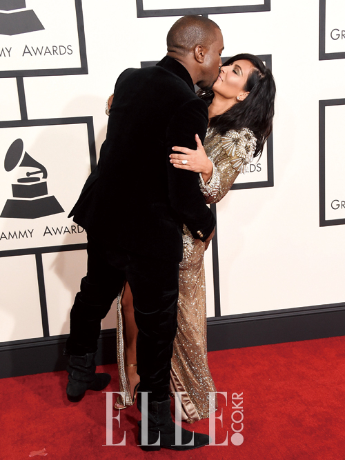 나이트가운을 연상시키는 장 폴 고티에의 골드 드레스로 눈부신 글램 룩을 완성한 킴 카다시언. 그녀의 아름다운 모습을 본 카니예 웨스트는 단 1초도 참기 힘들었는지 쉼 없이 그녀에게 진한 키스 세례를 퍼부었다.