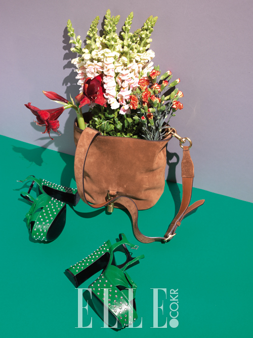 글라디올러스와 원교 카네이션이 수북하게 담긴 화분으로 변신한 스웨이드 호보백은 2백51만원, Gucci. 크리스털 스터드a가 박힌 청키 플랫폼 힐은 1백만원대, Saint Laurent by Hedi Slimane.