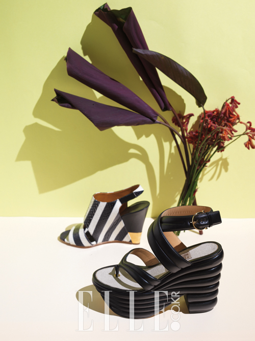마란타 시클라멘의 리드미컬한 기운을 닮은 스트라이프 패턴의 웨지 힐은 가격 미정, Chloe′. 블랙 스테이트먼트 플랫폼 슈즈는 가격 미정, Salvatore Ferragamo.