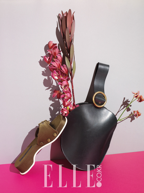 심비디움과 선샤인 코네부쉬가 무심하게 꽂힌 블랙 커브드 백은 가격 미정, Ce′line. 새틴 슬라이드는 가격 미정, Marc Jacobs.