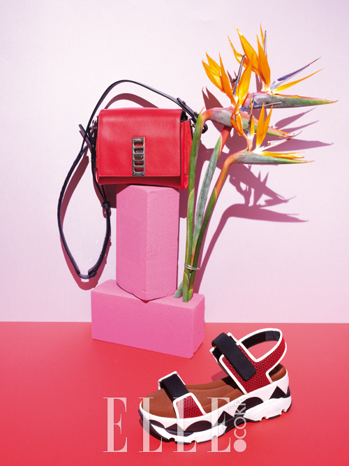 극락조화가 꽂힌 오아시스 위에 놓인 미니 스퀘어 백은 가격 미정, Proenza Schouler. 기하학적인 아웃솔이 돋보이는 스포티 샌들은 가격 미정, Marni.