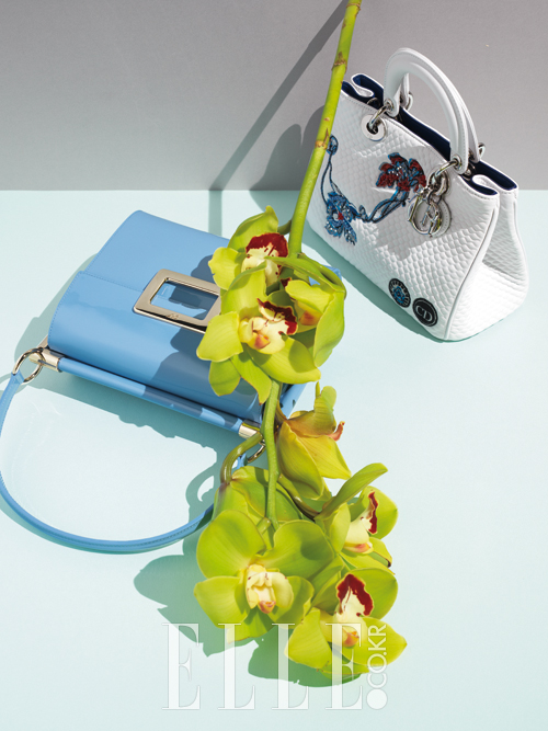 유연하게 흐르는 심비디움 아래 놓인 페이턴트 스퀘어 백은 3백20만원대, Roger Vivier. 비즈와 꽃을 섬세하게 수놓은 화이트 디오리시모 백은 가격 미정, Dior.