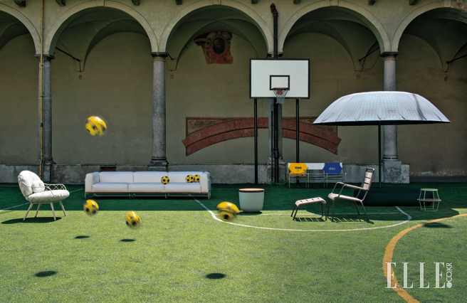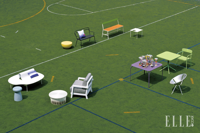 (왼쪽부터) 맨 끝에 있는 흰색 의자 식스티스(Sixties)는 알루미늄 관이 우아하게 꺾인 모양이 돋보이며 프레데릭 소피아가 디자인했다. 216유로, Fermob. 나무 상판을 덧댄 알루미늄 테이블 밀토(Mirto)는 안토니오 치테리오가 디자인했고 2546유로, B&B Italia. 옆에 놓인 시멘트색 알루미늄 의자 워싱턴 스켈레톤™(Washington Skeleton™)은 데이비드 아디아예가 디자인한 제품으로 805유로, Knoll. 뒤편 축구 골대 옆에 나란히 놓인 벤치형 의자 2개는 모두 안나 에프벌런드가 디자인했고 각 79유로, 39.9유로, 모두 Ikea. 골대 오른쪽에 둔 1인용 접이식 의자는 왼쪽 나무 상판 테이블과 세트로 구성된 밀토(Milto)로 안토니오 치테리오 디자인, 923유로, B&B Italia. 꼬아놓은 듯한 피복 튜브가 등받이까지 올라오는 토스카(Tosca)는 모니카 아르마니가 디자인했다. 2986유로, Tribu. 두툼한 쿠션이 의자 전체를 이루고 있는 실내와 아웃도어 겸용 소파 클라우드(Cloud)는 안드레아 파리지오 디자인, 1780유로, Meridiani. 자연 티크목을 쓰고 등받이 부분은 털실로 짠 듯한 효과를 낸 패트닉 노르게 디자인의 의자 니트(Knit)는 Ethimo. 오른쪽 끝에 야구공을 연상케 하는 컬러 패턴의 1인용 소파 롤(Roll)은 파트리시아 우르키올라가 디자인한 제품으로 1650유로, Kettal.