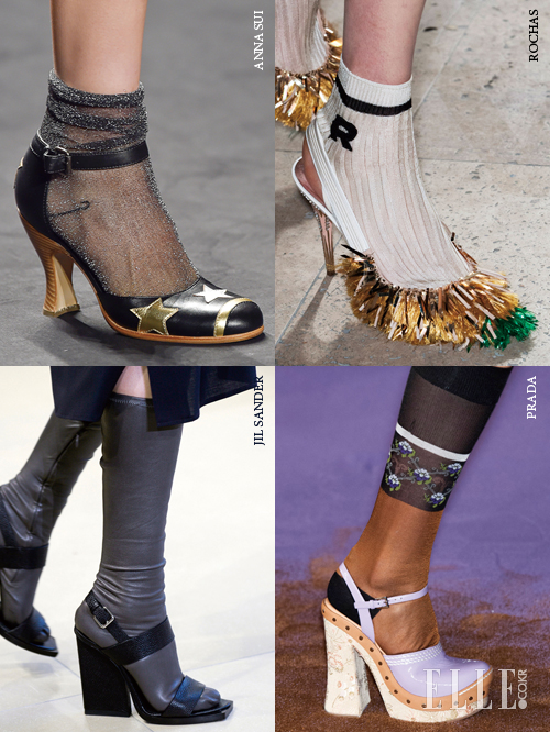뉴 시즌의 키 아이템인 플랫폼 샌들을 즐기는 방법 중 하나로, 개성 있는 삭스 스타일링을 응용해 보는 건 어떨까. 질 샌더의 로돌포 파글리아룬가는 부드러운 나파 가죽 양말을 샌들과 매치했고, 미우치아 프라다는 콜라주 니 삭스를 청키한 플랫폼 샌들과 매치했으며, 로샤스는 슬링백에 맞춰 뒤꿈치에 구멍이 난 양말을 매치했다.
