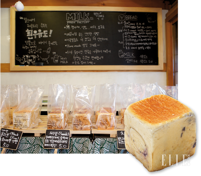 앙증맞은 깍두기 모양으로 잘 알려진 밀크의 식빵. 종종 식빵 크기가 작다는 이유로 실망감을 표시하는 이들도 있지만 막상 빵의 단면을 잘라보고 난 뒤엔 빈틈없이 단단한 성김에 반해 계속 찾게 된다. 버터와 물을 제외하고 온전히 우유만 넣고 반죽을 치댄 뒤 하루 동안 저온 숙성시킨 덕에 식감이 쫀득쫀득 살아 있다. 플레인, 크림치즈, 초코, 씨앗, 호밀 식빵 등 모두 합쳐 8가지 종류로 무의식중에 자꾸 손이 갈 정도로 중독성이 있다. 직접 잎 차를 내려 만드는 밀크 티(밀크 티, 우롱 밀크 티, 곡물 밀크 티)를 식빵과 곁들여 먹으니 이보다 더 달콤한 오후의 간식이 없다.