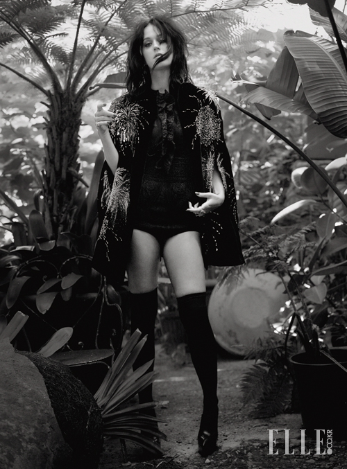 벨벳 소재 케이프는 가격 미정, Saint Laurent by Hedi Slimane. 실크 톱은 1185달러, Miu Miu. 자수가 놓인 브리프는 2195달러, Dolce & Gabbana. 다이아몬드와 블랙 로듐으로 장식한 골드 이어링은 가격 미정, Noor Fares. 다이아몬드가 박힌 골드 링 두 개는 각 2350달러, David Yurman. 다이아몬드가 박힌 화이트 골드 링은 가격 미정, Colette. 사이하이 삭스는 52달러, Wolford. 가죽 소재 펌프스는 1325달러, Vera Wang Collection.
