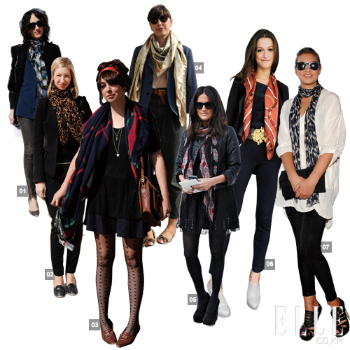 magical scarves 1 다크 블루 컬러의 티셔츠와 어우리는 블루 프린트 패턴 그레이 스카프를 함께 연출했다. 역시 밋밋한 티셔츠 룩에는 스카프가 제격이다. 2 레오퍼드 패턴의 스카프는 트렌드 리더라면 옷장에 꼭 구비해 두어야 할 아이템. 어떤 룩에 연출해도 스타일리시한 기운을 불어넣어 준다. 3 런던 스트리트에서 만난 패셔니스타. 브리티시 감성을 적극 반영한 굵직한 체크 패턴 숄을 자연스럽게 어깨에 걸쳐 스카프처럼 연출했다. 예상 외의 아이템을 자신만의 방식으로 활용한 점이 돋보인다. 4 매니시한 룩에 글리터링한 골드 스카프를 칭칭 둘러 마무리했다. 5 레이스 스커트와 레더 재킷에 오리엔탈 무드의 프린트가 인상적인 스카프를 더했다. 6 헤드 투 토 블랙 룩이 지루하다고 느껴진다면 클래식한 느낌의 스카프에 볼드한 장식이 있는 벨트를 매치해 색다른 분위기를 연출해 보길. 7 블랙 앤 화이트 공식에 충실한 룩. 내추럴한 화이트 셔츠 위에 블랙 앤 화이트 프린트 스카프로 포인트를 주었다. 공식에만 너무 연연하지 않고 블랙 클러치백 대신에 컬러감이 있는 클러치백으로 바꾸어준다면 더욱 생기 있는 룩을 연출할 수 있을 것. |