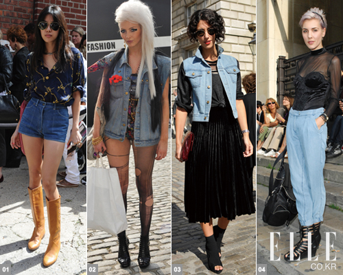 danim paradise 1 세일러풍의 블라우스와 함께한 데님 쇼츠는 빈티지 무드 연출에 제격이다. 2 일부러 찢는 스타킹이 대세가 된 요즘, 앨리스 데럴이 아낄 법한 배기한 데님 베스트를 뾰족한 어깨 장식 보디수트 위에 연출했다. 3 플리츠 스커트 대변신. 질끈 묶은 티셔츠와 짧으 데님 베스트와 함께한 플리츠 스커트는 더 이상 클래식한 아이템이 아니다. 4 요염한 코르셋이 연상되는 톱에 밝은 데님 팬츠를 연출했다. 언밸런스 아이템이 모여 만들어낸 환상의 조합이 아닐는지. |
