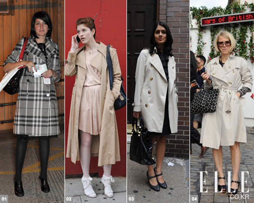 trench coats 1 볼드한 체크 패턴이 있는 트렌치코트 하나로 특별한 액세서리 없이 고상하게 무게감 있는 룩을 연출했다. 2 리본 양말이 인상적인 여인은 종아리까지 덮는 롱 트렌치코트를 벨트 없이 연출해 부드럽게 흐르는 듯한 여성스러움을 부각시켰다. 3 트렌치코트야말로 단아한 느낌의 레이디 룩 연출에 제격인 아이템이다. 프릴 장식이 있는 블랙 드레스에 트렌치코트를 걸치고 메리제인 슈즈로 마무리했다. 4 걷어올린 소매 아래로 보이는 스트라이프 패턴이 평범한 트렌치 룩에 생기를 불어넣었다. 블랙 포인트 백과의 컬러 매치도 굿! |
