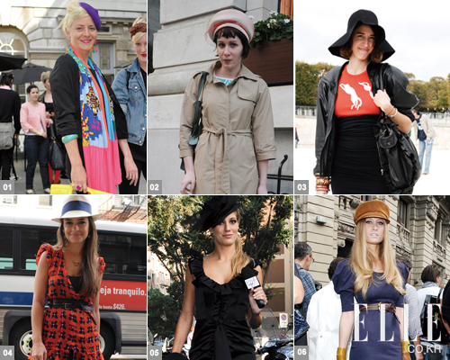 unique hats 1 전체적으로 화려한 네온 컬러를 연출했지만 블랙 재킷으로 과한 느낌을 피했다. 헤어 장식처럼 연출한 빈티지풍의 퍼플 베레가 블론드 헤어와 잘 어울린다. 2 단발머리와 꼭 어울리는 볼륨 있는 베레를 썼다. 빈티지 느끼므이 트렌치코트와도 찰떡 궁합인 듯. 모자에 장식된 레드 리본과 베일이 독특하다. 3 와이드한 챙은 햇빛 쨍쨍한 여름날에만 쓰는 것이 아니다. 자연스럽게 늘어지는 챙이 부드러운 느낌을 살려준다. 레드 티셔츠와 블랙 하이웨이스트 스커트, 폴카 도트 패턴 타이즈와 함께 유니크한 룩을 만들었다. 4 상큼한 오렌지 컬러의 샤넬 드레스와 네이비 컬러 와이드 밴드가 둘러기 스트로 햇 때문에 벌써부터 바캉스 시즌이 다가온 느낌이다. 5 생생한 스트리트 룩을 전달하는 TV 리포터도 드라마틱한 모자로 한껏 멋을 냈다. 프릴과 드레이프 장식의 드레시한 룩에 걸맞은 과감한 모자 선택이 돋보인다. 6 스웨이드 소재의 밀리터리 햇이 드레스 어깨의 풍성한 볼륨과는 대조적으로 딱딱한 느낌을 연출해 룩과 다소 동떨어진 느낌을 줘 아쉽다. |