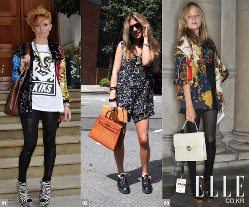 back to the vintage 1 원색의 스팽글 장식 재킷과 로큰롤 무드의 티셔츠, 지브라 프린트 부츠가 80년대 레트로 룩을 완벽히 재현해냈다. 목걸이 같은 액세서리는 물론 독특한 헤어스타일도 빈티지 룩을 완성하는 데 한 몫했다. 2 와일드한 프린트 패턴의 점프수트에 독특한 주얼 장식이 박힌 워커를 매치했다. 마무리는 클래식하지만 어떤 룩에나 잘 어울리는 에르메스 백으로. 3 어릴 적 엄마의 옷장에서 봤음직한 프린트 패턴의 재킷을 과감히 스트리트 룩으로 변모시켰다. 낡은 듯한 백도 퍼펙트! |