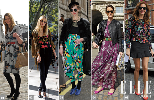 floral prints 1 빈티지 숍에서 찾을 수 있을 법한, 잘록한 허리 라인이 돋보이는 플라워 프린트 드레스. 그레이 컬러와의 궁합을 자랑하는 레드 벨트로 쏙 들어간 허리 라인을 강조하는 센스는 10점 만점에 10점! 2 장미가 그려진 뷔스티에를 레오퍼드 프린트 숄과 함께 매치했다. 3 그린 컬러의 하렘 팬츠 위에 컬러풀한 튤립 꽃이 피었다. 지나가는 사람드링 할머니 '몸빼 바지' 같다며 놀릴지언정 당당하게 거리를 활보하는 그녀의 애티튜드가 돋보인다. 4 장미 모양을 한 주얼 프린트가 장식된 독특한 드레스도 있다. 퍼플 컬러의 롱 드레스에 레더 재킷을 매치해 부담스러운 서머 드레스 느낌보다 캐주얼한 데이 웨어 느낌을 살렸다. 하늘하늘 바람에 날리니 더욱 아름다운 듯. 5 빈티지 풍의 롱 슬리브 톱에 블랙 미니스커트를 매치했다. 글리터링한 톱 장식에 맞춘 벨트가 인상적이다. |