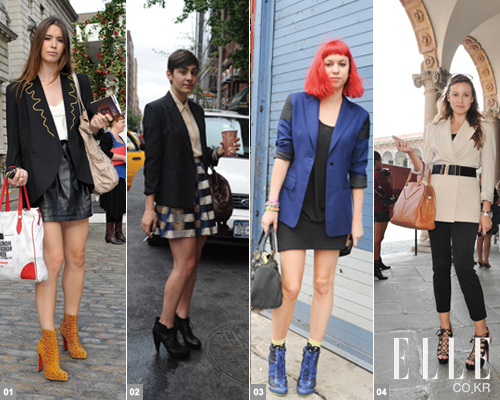 hot blazers 1 골드 포인트 블레이저 재킷을 레더 미니스커트와 매치했다. 스터드 장식 슈즈로 승부수를 띄운 건 탁월한 선택. 2 실크 셔츠와 매니시한 블랙 블레이저 재킷에 독특한 프린트의 스커트를 선택했다. 3 어깨의 주름 장식이 인상적인 블루 재킷을 스포티한 블루 부츠와 연출했다. 레드 헤어도 스타일에 한 몫한다. 4 벨트가 재킷에 비타민 같은 역할을 한다. 블랙, 크림, 브라운으로 이어지는 전체적 컬러 패턴이 부드럽다. |