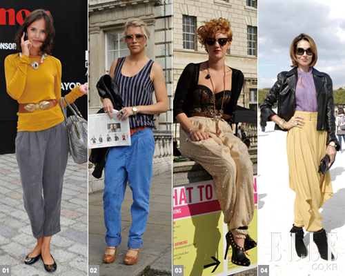 baggy pants 1 뉴욕 5번가에서 런던 스트리트로 날아온 듯한 여인. 목걸이와 벨트의 볼드한 주얼 장식이 인상적이다. 2 패션 피플들이여, 더 이상 코듀로이 팬츠를 금기시하지 마라. 당신의 센스에 따라 얼마든지 스타일리시한 아이템으로 탈바꿈할 수 있으니. 3 옛날 옛적 할리우드 글램 룩을 떠오르게 하는 화려한 스트리트 룩. 배기 팬츠로도 얼마드지 화려하고 섹시하게 연출할 수 있다는 사실! 4 엑스트라 커팅으로 만들어지는 부드러운 주름이 특징인 하렘 팬츠. 파스텔 톤의 실크 소재 의상에 블랙 라이더 재킷과 프린지 장식 부츠로 부드러운 느낌과 대조적으로 '거친'무드를 더했다. |