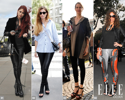 leggings 1 레더 레깅스와 스터드 장식의 레더 부츠. 여기에 볼드한 스터드로 장식된 백까지. 패션 위크 스트리트 룩의 록시크 열풍은 아직까지 계속되고 있다. 2 레깅스와 셔츠 혹은 레깅스와 니트 톱은 컬렉션 기간 스트리트에서 가장 많이 만나볼 수 있는 룩이다. 3 엉덩이를 덮는 길이의 배기한 톱을 레깅스와 함께해 내추럴한 볼륨감을 준다. 4 퓨처리스틱한 프린트 패턴이 인상적인 강렬한 레깅스가 한 눈에 들어온다. 상의 요소는 절제하고 네크리스와 뱅글로 레깅스와 어울리는 악센트를 준 것이 특징. |