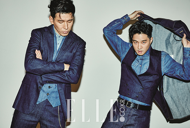 션의 데님 재킷은 Ralph Lauren Purple Label, 베스트는 Brunello Cucinelli, 셔츠는 Calvin Klein Jeans. 팬츠는 Ralph Lauren Purple Label. 지누의 데님 코트와 팬츠는 모두 Burberry Prorsum. 베스트는 Ralph Lauren Purple Label. 셔츠는 Brunello Cucinelli, 벨트는 스타일리스트 소장품.
