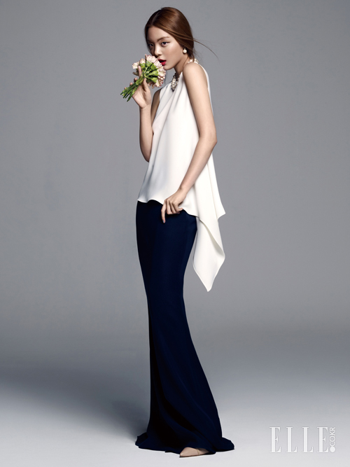 언밸런스한 라인의 슬리브리스 톱은 36만원대, 롱스커트는 73만원대, 진주 네크리스는 37만원대, 이어링은 23만원대, 슬링백 펌프스는 72만원대, 모두 CH Carolina Herrera.