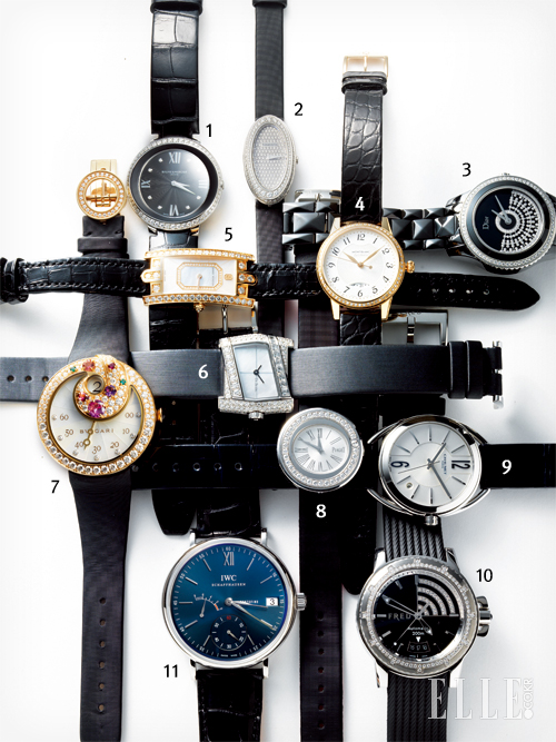 7 서로 대비되는 기하학적 브레이슬렛과 부드러운 원형 케이스의 조화가 돋보이는 ‘루체아 워치’는 가격 미정, 불가리.