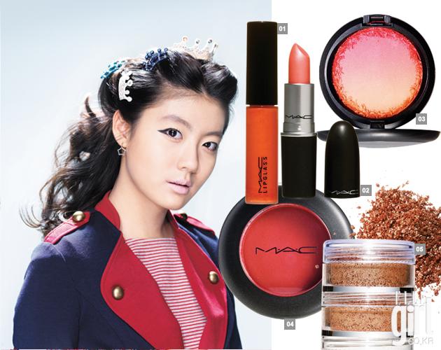 1 식물성 호호바 오일이 입술을 촉촉하게 가꿔주는 립글라스 컴크왓 탠저린. 4.8g. 2만5천원. 맥. 2 가볍고 촉촉한 질감과 뛰어난 발색을 자랑하는 립스틱 컬러미코랄. 3g. 2만5천원. 맥. 3 두 가지 컬러가 그라데이션되어 있어 컨디션에 따라 색깔을 조절할 수 있는 블러쉬 옴브레 라이프 피치. 9g. 4만원. 맥. 4 색감이 다양하고 발색력과 지속력이 좋은 아이섀도 핫핫핫, 스트로 하비스트. 각각 1.5g. 2만2천원. 맥. 5 브러시에 찍어 눈가에 블랜딩해 생동감을 더해주는 크러쉬 메탈 피그먼트-스택드 2! 페일길디드베이지, 쿠퍼골드. 12g. 가격 미정. 맥.