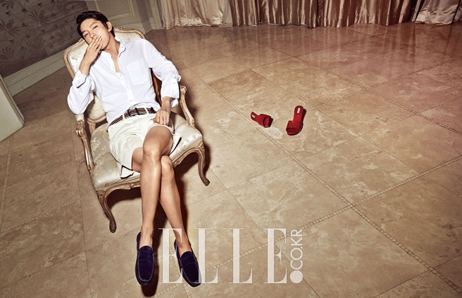 화이트 셔츠는 Club Monaco, 쇼츠는 Fred Perry, 벨트는 Ermenegildo Zegna, 슈즈는 Salvatore Ferragamo. 바닥에 있는 레드 뮬은 Miu Miu.