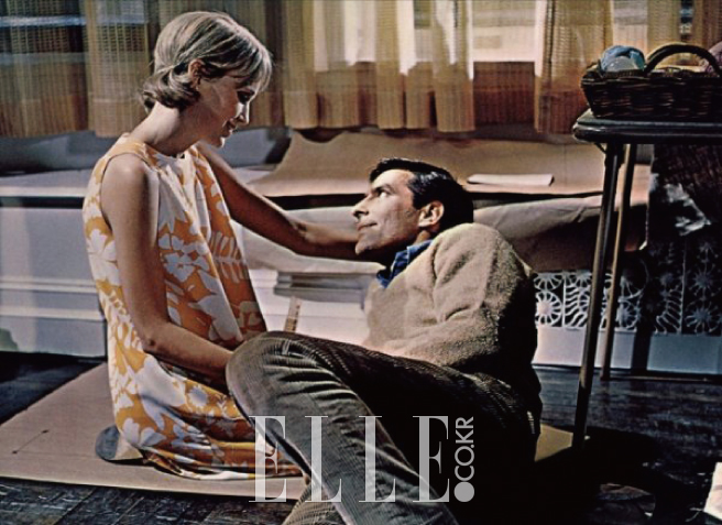 로만 폴란스키 감독의 영화 <악마의 씨>(1968)의 한 장면. 양 갈래 머리를 한 미아 패로와 극중에서 남편으로 등장하는 존 카사베츠가 서로 애틋한 눈빛을 주고받고 있다. 로맨스영화인 척하는 이 영화는 사실 여름을 겨냥한 스릴러 물로 미아 패로를 둘러싼 미스테리하고 기괴한 사건사고들이 연이어 일어나며 스토리가 전개된다. 공포스러운 장면들이 연이어 일어나는 가운데 스크린에서 눈길을 뗄 수 없는 이유는 미아 패로의 영화 속 의상 때문. 휴양지에서 입을 법한 트로피컬 패턴의 오렌지 선드레스나 미니멀한 핀 스트라이프 선드레스 등 편안하고 사랑스러운 드레스들이 어두운 스토리와 대조되며 극의 재미를 더한다.