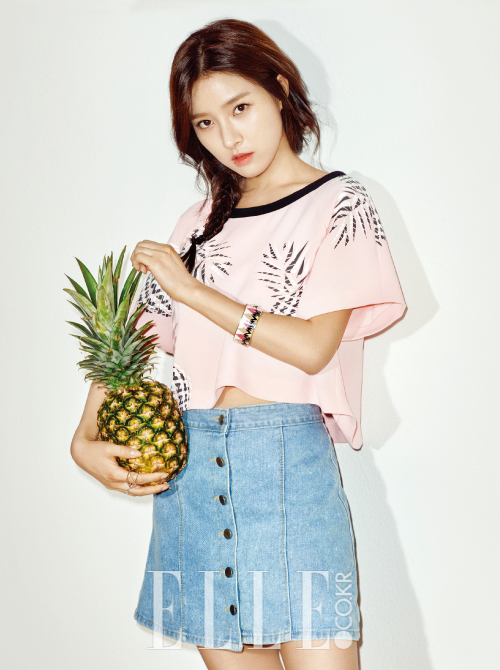 파인애플 프린트 크롭트 톱은 a.t.corner. 버튼다운 데님 스커트는 H:Connect. 뱅글은 Coach. 실버 링은 모두 Glory Arden.