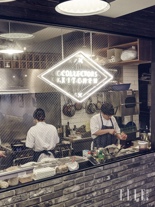 비스트로이자 갤러리 그리고 카페다. 벽에는 신진 작가들의 작품들이 전시돼 있고, 키친 앞에는 취향이 반영된 수집품들이 가지런히 놓여 있다. 식당이라고 해서 들어왔는데 갤러리에 앉아 있는 기분이다. 컬렉터스 키친은 레스토랑을 단지 식사만 하는 공간이 아닌, 문화라는 카테고리 안에 넣는다. 이곳에서 사람들은 자연스럽게 밥을 먹으며 예술이라는 주제를 대화 속에 버무린다. 안으로 쭉 들어가면 회색 벽돌과 어우러진 아담한 사이즈의 키친이 보인다. ‘COLLECTORS KITCHEN’이라고 적힌 마름모꼴의 네온 장식, 접시와 컵이 가지런히 정돈된 선반, 분주하게 움직이는 요리사들의 움직임이 한눈에 들어온다. 키친을 오른쪽에 두고 밖으로 나가면 비밀의 화원 같은 테라스가 나타난다. 여름이 오면 간단한 디너 파티를 즐겨도 좋겠다.