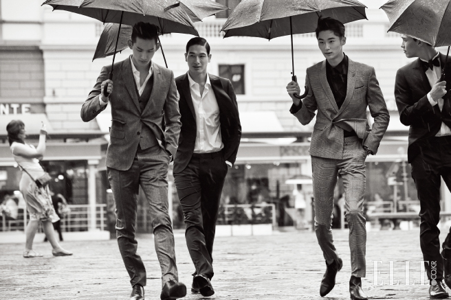 왼쪽부터 변우석의 수트는 The Kooples. 블랙 셔츠는 Saint Laurent by Hedi Slimane. 이요백의 턱시도 수트는 Lanvin. 박형섭의 스리피스 수트는 Dsquared2. 셔츠는 Saint Laurent by Hedi Slimane. 김영의 수트는 Z Zegna. 모든 제품은 Luisaviaroma에서 판매.