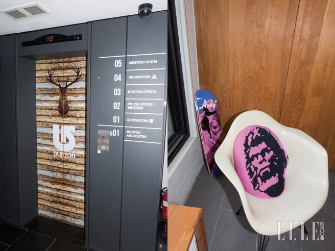 (왼쪽) 엘리베이터도 그냥 내버려두질 않는 콘텐츠 중독자들. 각 층마다 해당 층을 사용하는 브랜드 이미지로 프린트를 직접 제작해서 씌웠다.