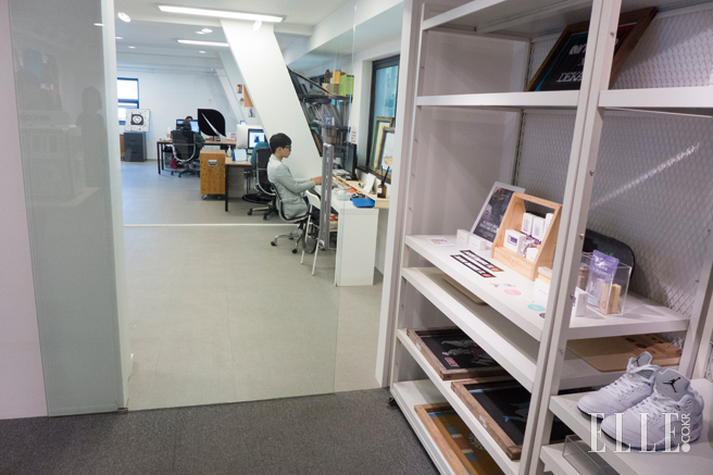애플의 액세서리와 실용적이되 특색 있는 가방을 만드는 인케이스의 한국 공식 수입원 프리즘 디스트리뷰션은 최근 신사동에 있는 5층 건물로 이사했다. 소문을 듣고 연락했을 때 홍보 담당자는 예상치 않게 난색을 표했다. “아직은 안 된다”는 모호한 답과 함께 연거푸 일정을 미루는데, 처음엔 기분이 썩 좋진 않았고 두 번째엔 호기심이 일었다. 마침내 촬영 날, 모든 의문은 금방 풀렸다. 지하까지 총 6층 규모의 빌딩 전체를 사용하면서도 인테리어 전문가를 고용하지 않고 모든 공사를 직원들이 직접 진행했다는 것이다. 요란한 인테리어나 번지르르한 마감재 같은 건 아무 데도 없었다. 다만 꽤 실용적으로 보이는 화이트 철제 가구들과 거실에나 어울릴 법한 나무 가구들, 그 외엔 전부 프리즘 디스트리뷰션에서 실제로 판매하는 물건들이다. VMD를 담당하는 주혜영 과장의 설명은 이렇다. “인테리어를 하려면 두세 달은 필요한데, 이전 사무실에서 빨리 이사를 나가야 하는 상황이었어요. 일단 이사 와서 아무것도 없는 1층에 전 직원이 모여 앉아 업무를 했고, 싸온 짐들은 다른 층에 일단 꾸역꾸역 넣었어요. 업무를 하면서 공사를 동시에 한 셈이죠.” 덕분에 대표이사를 포함한 전 직원이 다닥다닥 책상을 붙이고 앉아 공사 소음을 고스란히 들으며 몇 달을 보냈다는 눈물겨운 이야기에 모든 의심이 눈 녹듯 사라진 것은 물론, 실제 사무실을 쓸 사람들이 직접 꾸민 공간에 대한 흥미는 더해졌다.