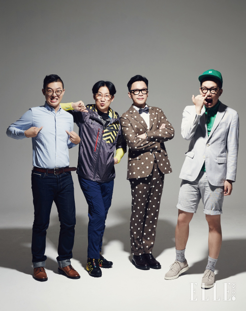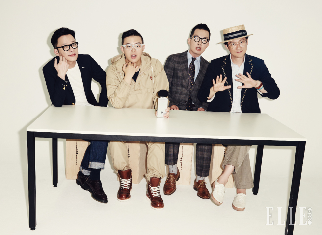 오늘 촬영을 위해 직접 스타일링해 오기로 했어요. 그중 숙제는 ‘내가 싫어하는 남자들의 패션을 재해석하라’였죠 이승준 나이 많은 분들이 검은 구두에 청바지 아무렇게나 입을 때가 보기 싫더라고요. 같은 청바지라도 멋있게 입을 수 있는 방법은 구두는 웰트(테두리)가 넓고 브라운 계열로 고르고 티셔츠 대신 셔츠를 입으면 클래식 룩을 완성할 수 있어요. 장윤수 요즘 유행하는 ‘놈코어 시크’를 한번 입어봤습니다. 제가 요즘 싸고 젊게 입는 방법을 열심히 찾고 있어서, 오늘 입은 옷은 실제로 모두 SPA 브랜드고 발랄한 색으로 입어봤어요. 정성호 전 원래 감색, 회색, 흰색에 데님만 입어요. 남들은 바꿔 입었는지도 모를 정도로만 스타일이 바뀌죠. 오늘은 굉장히 화려한 도트 무늬 수트를 입어봤습니다. 역시 잘 어울리더군요. 황의건 사람들이 가장 꼴 보기 싫어하는 등산복을 재해석해 봤어요. 근데 입어보니까 편하긴 하더라고요. 그래서 어번 아웃도어랄까, 도시에서 입을 수 있는 룩을 선택했고요. 너무 알록달록한 거 말고 정돈된 색을 입으면 됩니다.