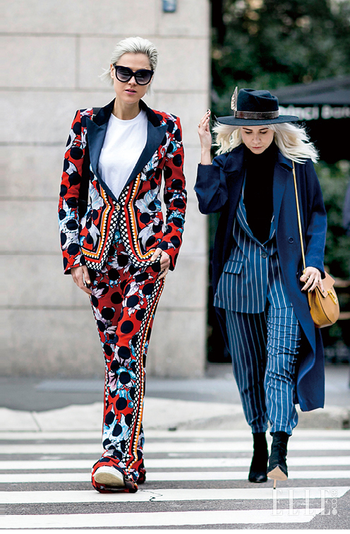 컬러풀한 수트와 클래식한 핀 스트라이프 수트를 차려입은 패션 피플들. 과감한 프린트 룩과 오버 코트, 페도라 햇으로 한껏 멋을 낸 젠틀맨 시크의 조우.