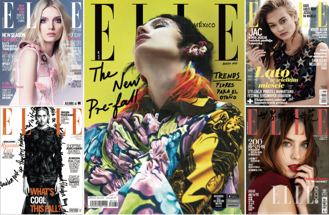 <엘르> 영국 2015년 8월호, <엘르> 세르비아 2015년 8월호, <엘르> 멕시코 2015년 8월호, <엘르> 폴란드 2015년 8월호, <엘르> 중국 2015년 8월호.