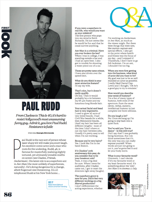 마블의 새 영화 <앤트맨>의 주인공으로 낙점된 폴 러드. 코미디 장르에서 오랜 경력을 쌓아온 그와의 인터뷰는 시종일관 유쾌했다. “영화에 대한 기대 탓에 촬영 때마다 인파가 몰렸지만 부담스럽진 않았어요. 원래 그 정도 인기는 있었어요.” “다양한 장르가 가능한 배우가 되려고 대니얼 데이 루이스를 롤모델로 삼았어요. 그게 실수였어요.” “운동을 해야 했지만 휴 잭맨처럼 몸을 크게 만들 필요는 없었어요. 난 개미처럼 작아지는 능력을 가진 히어로거든요.” 새로운 영웅이 등장한 게 분명하다.