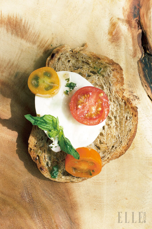 5 구운 통밀 빵의 한쪽 면에 마늘을 살짝 문질러 향을 더한다. 모차렐라 치즈를 올린 뒤 허브 소스를 바르고 토마토를 얹어 완성한다.