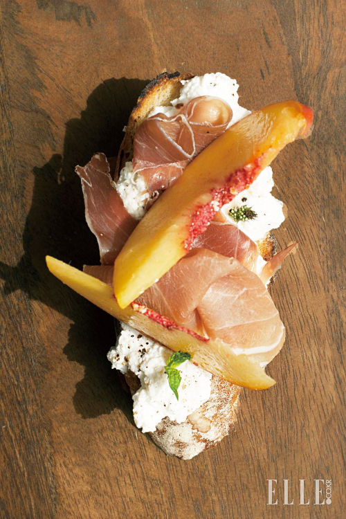 짭짤한 프로슈토의 맛을 악상으로 표현한다면 ‘크레센도’! 새콤한 천도복숭아는 맛의 세기에 파워풀한 힘을 보탠다. 미니 바게트에 프로슈토(Prosciutto; 이탈리아 북쪽 지방에서 생산되는 햄으로 밀도가 조밀하다)와 천도복숭아를 토핑해 카나페처럼 만든 토스트를 한 입 깨물면 입 안에서 폭죽이 터지듯 선명한 맛이 맴돌 것.
