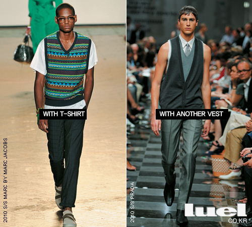 1 With T-shirts 스웨터 베스트를 캐주얼하게 연출하려면 티셔츠와 입어야 한다. 박시한 화이트 티셔츠 위에 페어아일 패턴 스웨터 베스트를 매치한 마크 바이 마크 제이콥스 컬렉션처럼. 너무 10대 같아 부담스럽다면 공식만 응용하자. 피케 셔츠에 심플한 네이비 스웨터 베스트를 입거나, 아이보리색 크루넥 티셔츠에 실크와 캐시미어가 섞인 얇은 그레이 스웨터 베스트를 입는 것이다. 여기에 깔끔한 블레이저나 카디건을 걸치면 더욱 센스 있어 보인다. 2 Vest Layering 베스트 위에 베스트를 또 입는, 약간은 난해한 스타일링이 눈에 띈다. 대표적인 건 프라다. 소매가 잘린 셔츠에 타이를 매고 브이넥 스웨터 베스트를 입은 뒤 카디건 형태의 베스트를 또 걸친 것이다. 에르메스 역시 카디건 형태의 베스트를 톤온톤으로 레이어링해 색다른 룩을 선보였다. 시도할 용기를 가진 남자들에게 조언할 건 한 가지다. 스웨터 베스트를 두 겹으로 입겠단 생각 따윈 하지 말라는 것.
