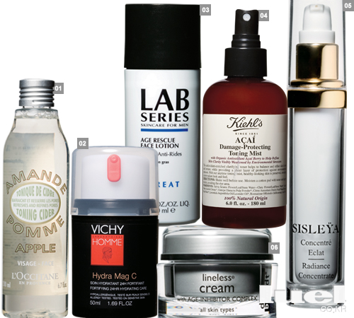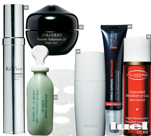 1 집중적인 안티 에이징 라인에선 세럼의 사용이 무엇보다 중요하다. 모이스처라이저 전 단계에 사용하는 세럼은 여러 가지 핵심 성분만을 뽑아 농축 시킨 것. 가벼운 질감으로 빠르게 흡수되며 피부 재생을 도와 세포 재생 속도를 촉진시키는 안티 에이징 세럼. 인텐시트 볼룸라이징 세럼 스킨랩+ 30ml 91만원 2 40대들이 꼭 사용해야 할 제품 중 하나가 바로 나이트 전용 영양 크림이다. 단 반드시 고농축 기능성 제품을 선택할 것. 충분한 보습력은 물론 피부의 영양 공급과 함께 안티 에이징 기능을 함께 포함해야 더욱 효과적이다. 밤 사이 세포 재생 및 피부 방어력을 높여주는 나이트 전용 크림. 퓨처 솔루션 LX 토털 리제너레이팅 크림 시세이도 50ml 40만원 3 화이트닝 및 항산화제 성분이 농축된 마스크 제품. 칙칙한 피부톤을 개선시켜 주며 항산화제 성분이 흡연, 음주 등 유해 환경으로부터 피부를 보호하고 노화를 방지해준다. 저녁 세안 후, 상하로 나뉘어진 마스크를 부착한 후 완전히 흡수되면 떼어낸다. 안티 에이징 케어와 화이트닝 효과를 동시에 얻을 수 있다. 인퓨전 프라이머&화이트닝 마스크 라메르 8set 46만원 4 탄력이 급격히 저하되는 눈가 피부는 반드시 아침, 저녁으로 사용할 수 있는 아이크림을 선택해 발라주는 것이 좋다. 극도로 민감한 부위므로 문지르듯 바르는 대신 힘이 약한 손가락을 사용해 톡톡 두드리듯 바르거나 브러시 등을 사용해야 자극을 덜 수 있다. 벨르 드 주르 엔젤 아이케어 겐조키 50ml 10만7천원 5 깊게 패인 이마 주름과 입가의 팔자 주름이 고민이라면 이 부위를 집중적으로 케어해 줄 수 있는 제품을 따로 사용하는 것이 좋다. 주름 방지는 물론 이미 생성된 주름을 팽팽하게 잡아당겨주는 효과적인 안티 링클 케어 제품. 포스 수프림 뉴트럴라이저 비오템 옴므 40ml 7만2천원 6 나이를 극명하게 드러내는 곳 중 하나가 바로 목 주름이다. 제 아무리 매끄럽고 탱탱한 피부의 남자라도 목에 생긴 주름은 그 남자의 연륜과 나이를 가늠케 한다. 턱 아래 늘어진 피부를 탄력 있게 가꿔주며, 리프팅 효과를 더해주는 넥 케어 안티 에이팅 제품. 수프라 데콜테&넥 컨센트레이트 클라란스 50ml 13만원