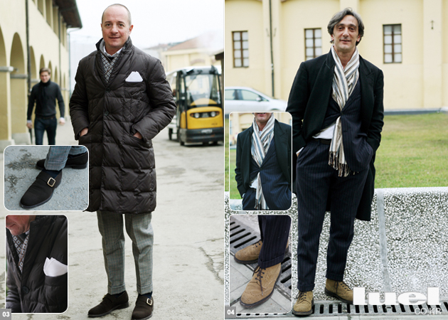 4 깔끔한 블랙 코트와 네이비 스트라이프 수트의 차분하면서도 편안한 매치가 돋보인다. 적당히 턴업된 팬츠 길이도 OK. 그런데 뜬금없는 캐멀 컬러 스웨이드 슈즈라니. “스트라이프 머플러를 선택해 얼마나 다행인가. 만약 블루 스트라이프 타이를 연출했다면 이 남자는 분명 뉴욕 증권가의 비즈니스 맨처럼 보였을 것이다.” -꼬르넬리아니 이사 전광석