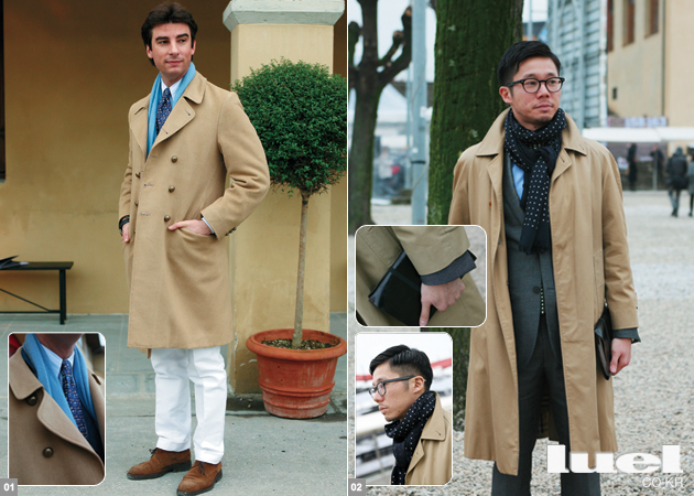 2 트렌치 코트는 오래된 무성영화나 빛바랜 흑백 사진처럼 아날로그적 감성이 묻어 있다. 베이식한 트렌치 코트일수록 스타일의 영향력은 커진다. 베이지 컬러 트렌치 코트는 50년 전에도 중후한 신사들의 아이템이었고, 지금도 클래식 스타일의 표본이다. 이런 정직한 트렌치 코트에는 담백한 그레이 수트와 블루 셔츠의 조합이 최상이다. -일치르꼬 디렉터 강원식 |