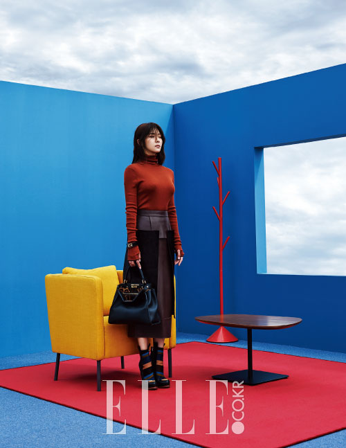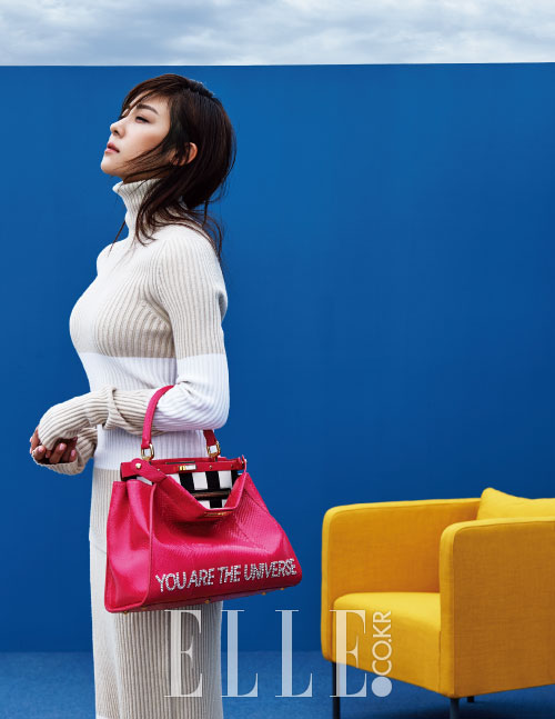 아이보리와 화이트 컬러 블록의 터틀넥 니트와 롱스커트, 핑크 파이톤 소재의 하지원 피카부 백은 모두 Fendi.