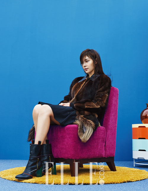 투 톤 컬러의 튜브 롱 드레스와 크리스털 장식의 김연아 피카부 백, 바이올렛 폭스 퍼 트리밍 부티, 로고 장식의 브레이슬렛은 모두 Fendi.