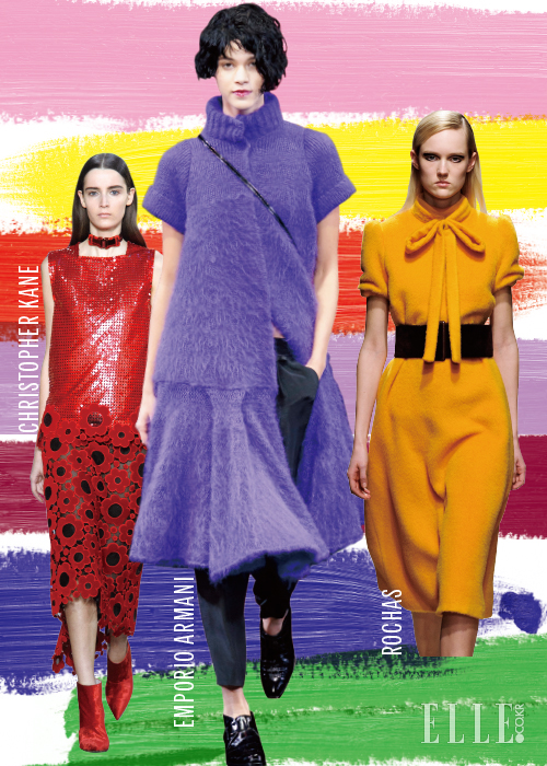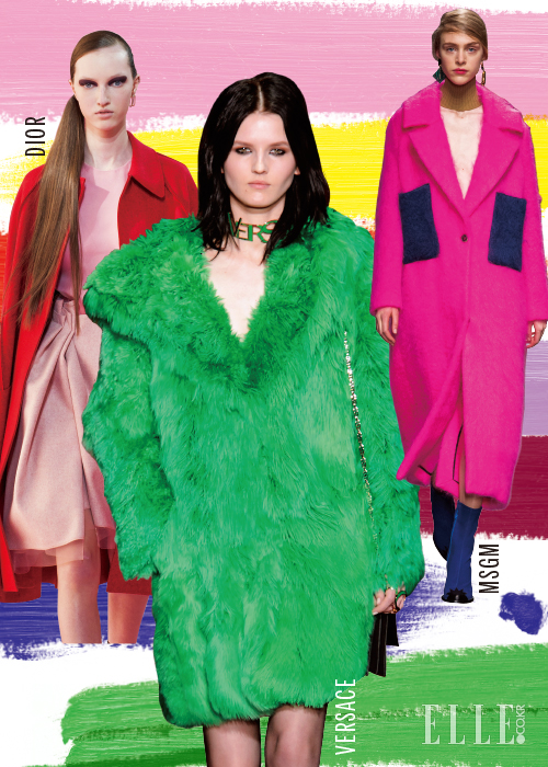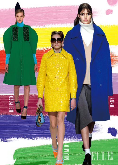 부쩍 쌀쌀해진 날씨에 다운된 기분을 한 방에 업시켜 줄 비장의 무기가 있으니 바로 볼드한 팝 컬러다. 베르사체의 그린 퍼 코트나 미우미우의 선샤인 옐로로 물들인 레더 코트처럼 럭셔리한 소재로 변신을 꾀한 팝적인 접근이 흥미롭다. 컬러 아우터웨어가 부담스럽다면 DKNY나 디올처럼 톤다운된 무채색의 이너웨어를 믹스해도 좋다.